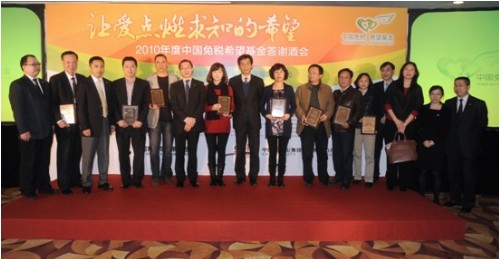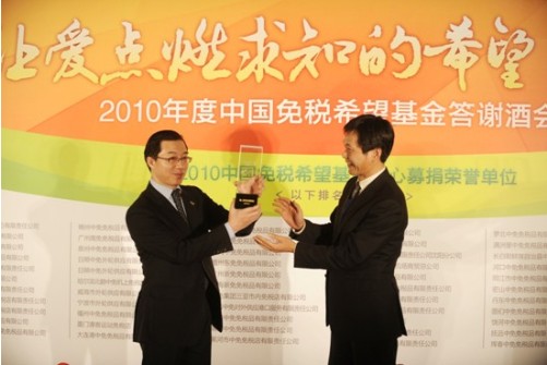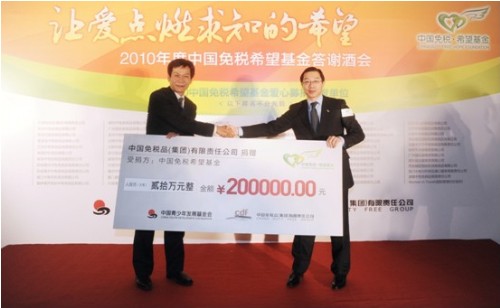 Mr.Tu Meng, Secretary General of the China Youth Development Foundation, gave a speech. Mr. Chen Guoqian, Vice President of China Duty Free Group Co., Ltd., also gave a speech on behalf of the China Duty Free Hope Foundation. All members of the CDFG leader group were awarded the medal of the “2010 Honored Units of China Duty Free Hope Foundation” on the stage. Although the “China Duty Free Hope Foundation” was founded by CDFG only three years previously, it has made outstanding contributions to China’s charity undertakings. Therefore, the China Youth Development Foundation was awarded the specially established “Outstanding Public Partner for the 20 Years of Project Hope” to the China Duty Free Group.