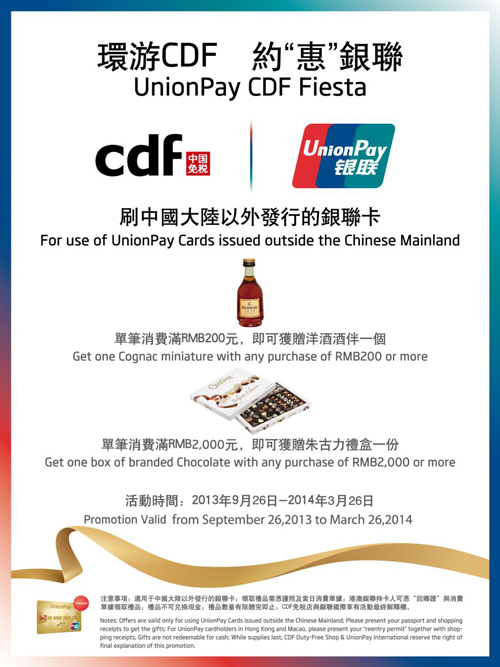 When using UnionPay Cards issued outside Mainland China, you will get one Cognac miniature with any purchase of RMB 200 or more and get one box of branded chocolate with any purchase of RMB 2,000 or more.