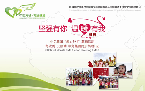 On April 2, a 7.0 Richter scale earthquake struck Ya’an of Sichuan Province, and the hearts of the Chinese people. After the earthquake, many enterprises, social organizations, and the public took immediate action to support the earthquake-struck area in a variety of different ways. As a landmark event in China’s duty-free industry, China Duty Free Group Co., Ltd. (CDFG) joined hands with China Youth Development Foundation once again after the Wenchuan and Yushu earthquakes to carry out the “Love 1 + 1” disaster relief and student sponsorship donation for Ya’an, in order to offer their love to the children in this area, help them overcome the disaster and rebuild their homes as soon as possible.