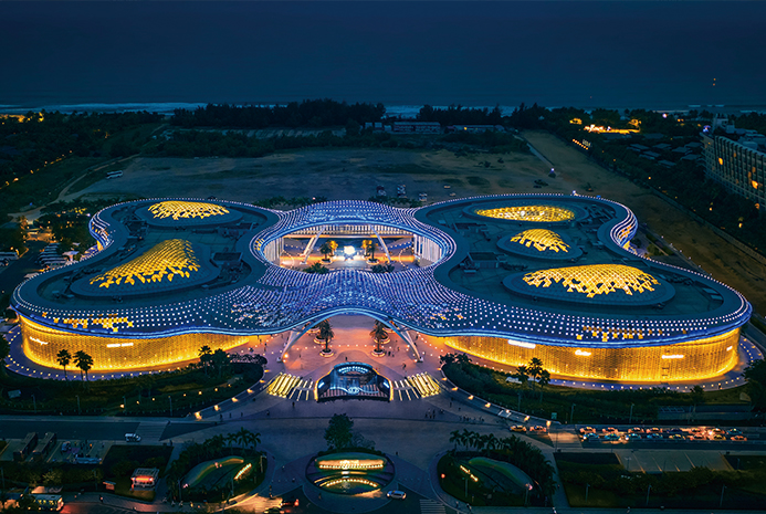三亚国际免税城建筑设计灵感源于有着“国艳”之称的海棠花,采用世界知名建筑设计公司打造的连续空间曲面钢结构,如同一朵娇艳的“海棠花”盛开在蔚蓝海岸线。由国际知名室内设计团队倾力打造的室内空间,也将艺术群落与时尚元素巧妙的结合起来。不论是美轮美奂的“海棠”夜景,还是独具匠心的室内设计,都将为游客带来独特的视觉刺激、感官冲击和丰富的购物享受。
